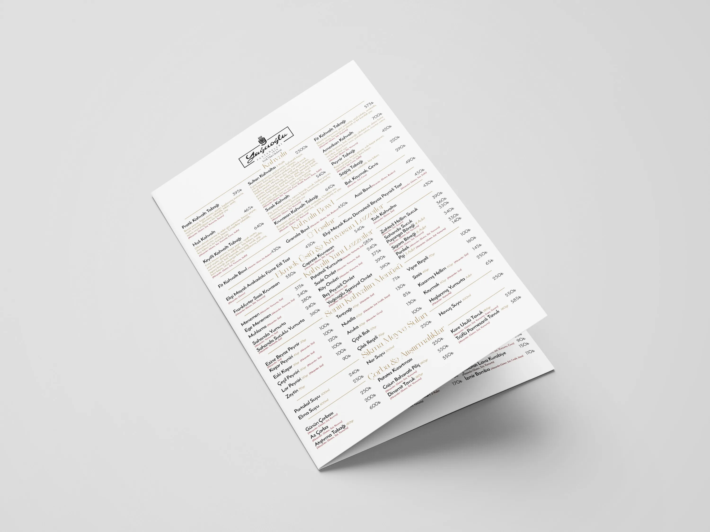 Mukavva menü; sert ve dayanıklı karton (mukavva) malzemeden üretilen, uzun ömürlü menü modelidir. Kalın yapısı sayesinde masada sağlam durur, kolay deforme olmaz ve yoğun kullanıma uygundur. Kafe, restoran ve fast food işletmeleri için hem şık hem de pratik bir çözümdür. Marka kimliğinizi güçlü ve düzenli bir şekilde yansıtmanıza yardımcı olur.